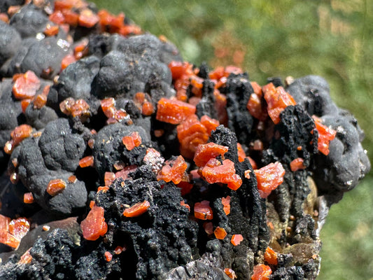 Vanadinite on black botryoidal manganese oxides