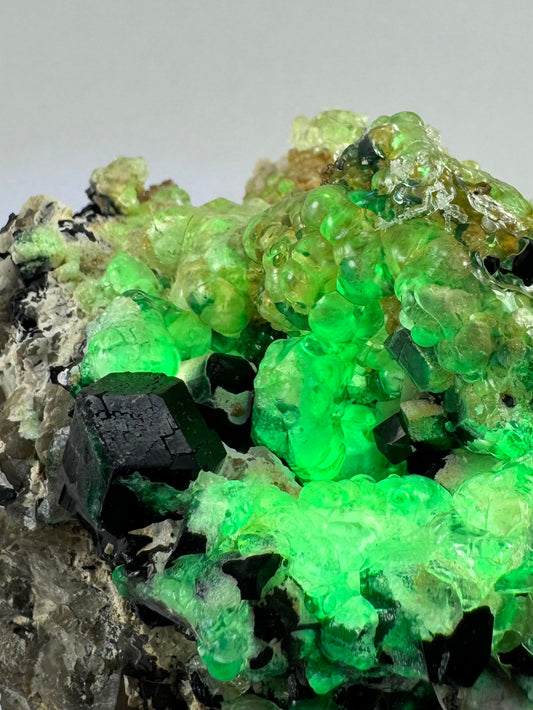 Black tourmaline and smoky quartz on albite matrix with hyalite