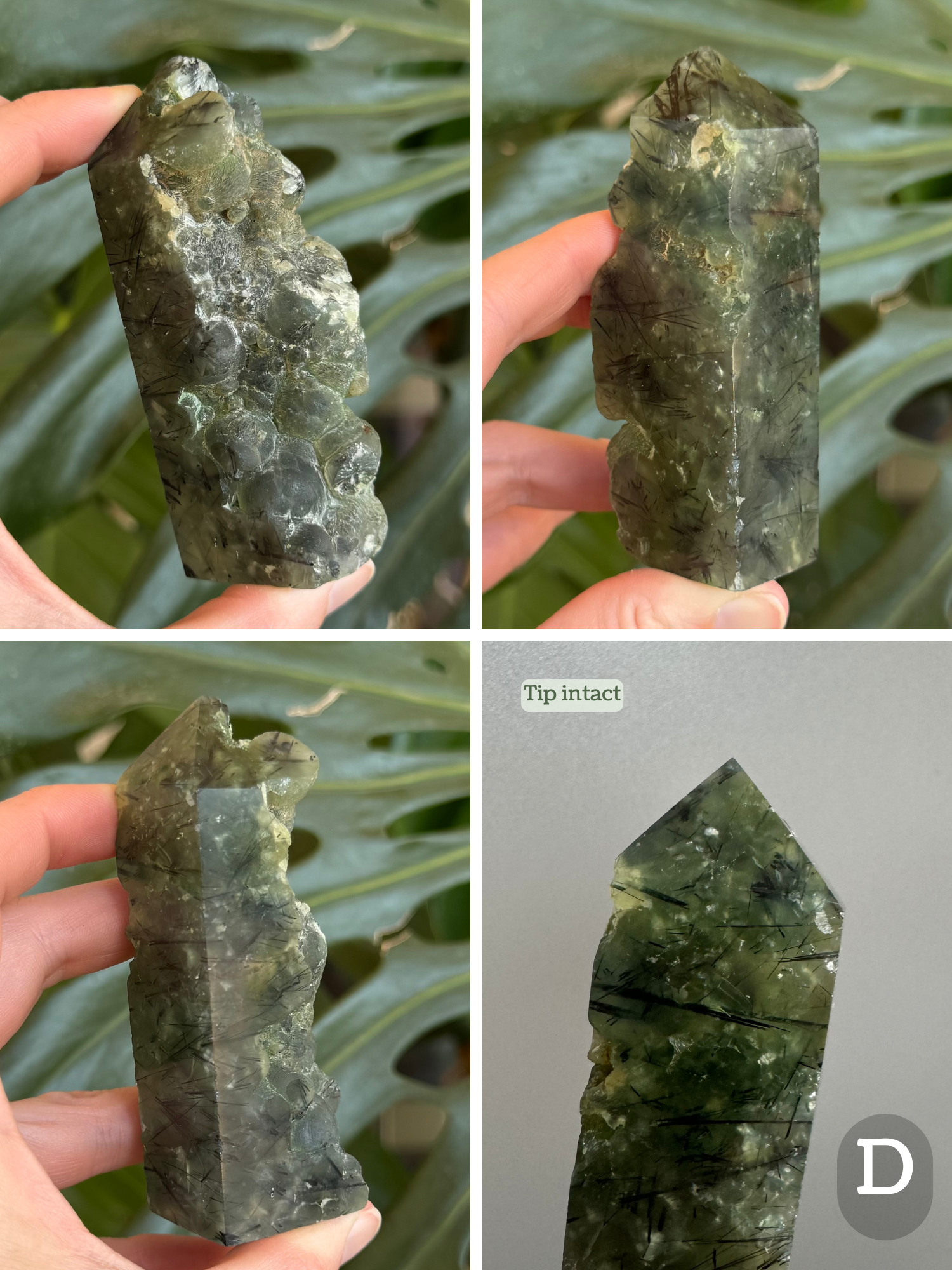 Alternately called points or obelisks, these towers are cut and polished from botryoidal prehnite pierced with dark needles of epidote. I prefer to pick towers with open cavities that reveal the mineral structure, and these points have excellent raw (natural, unpolished) edges and openings revealing the botryoidal prehnite formations.